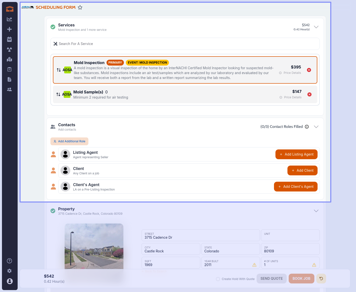 The duration for the AOSA service ‘Mold Inspection’ is not calculating properly. It’s set to a 2 hour duration but does not reflect in the order entry screen (top right).