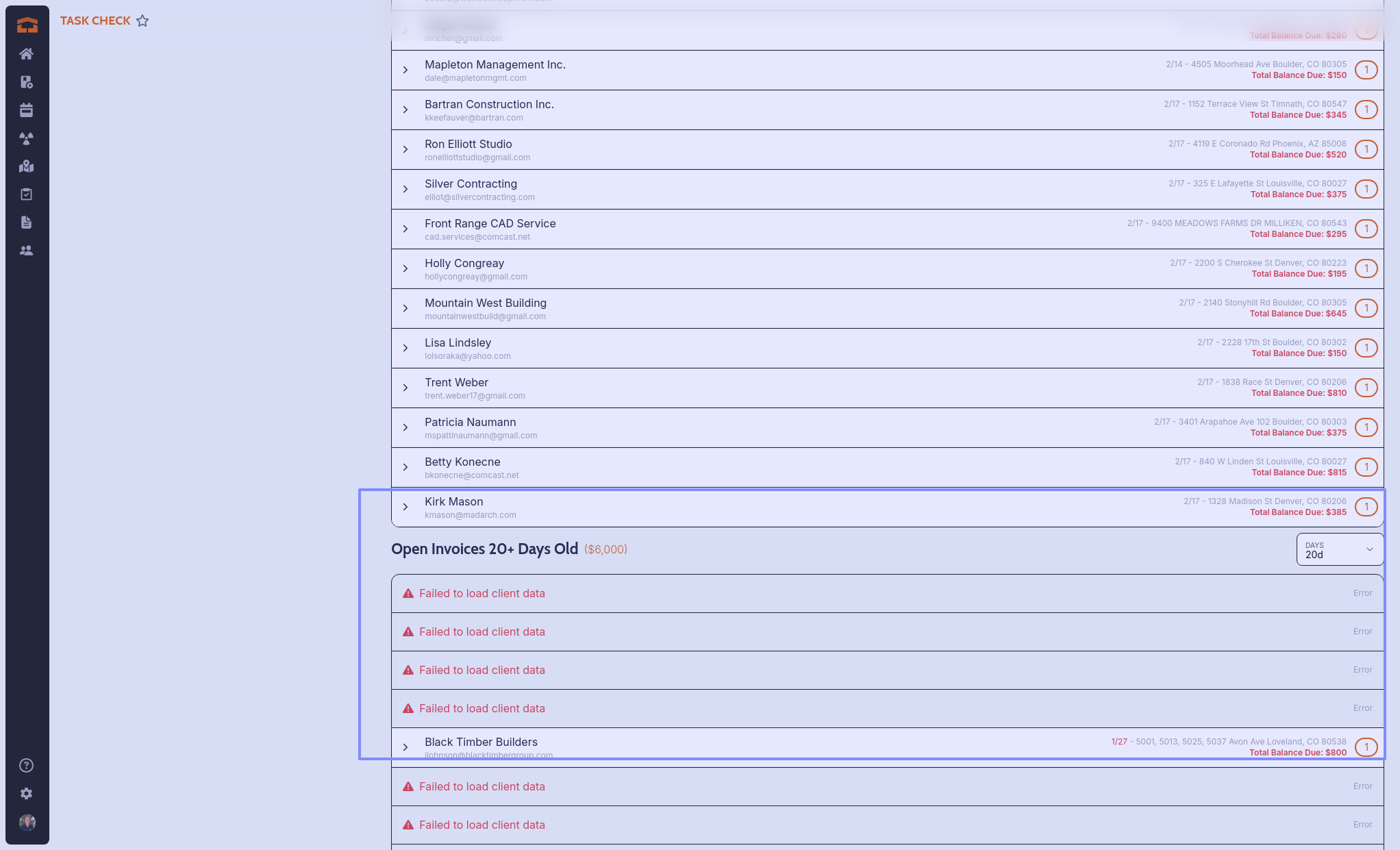 Often says failed to load client data on either unpaid or open invoice. VERY slow to load these last days